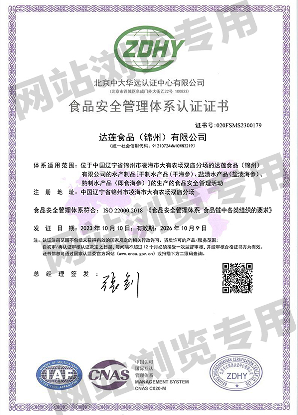達蓮公司的遼參產(chǎn)品通過養(yǎng)殖、加工雙有機產(chǎn)品認證、遼參認證、ISO9001質(zhì)量管理體系要求認證ISO22000食品安全管理體系、食品鏈中各類組織的要求認證、HACCP危險分析與關(guān)鍵控制點認證等。